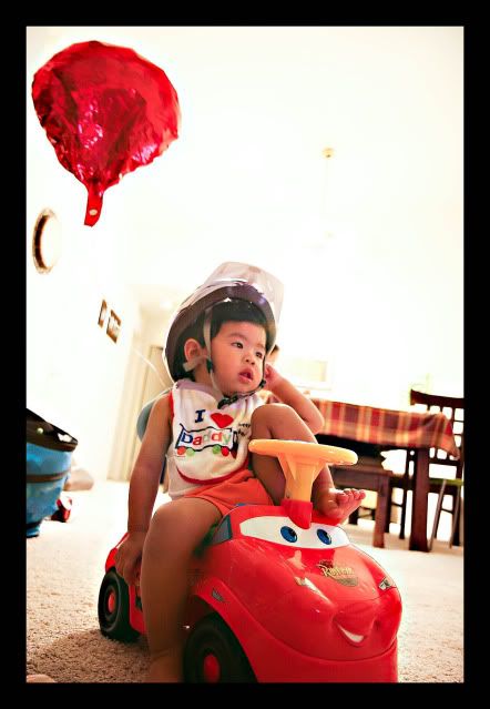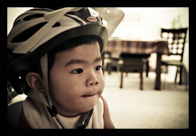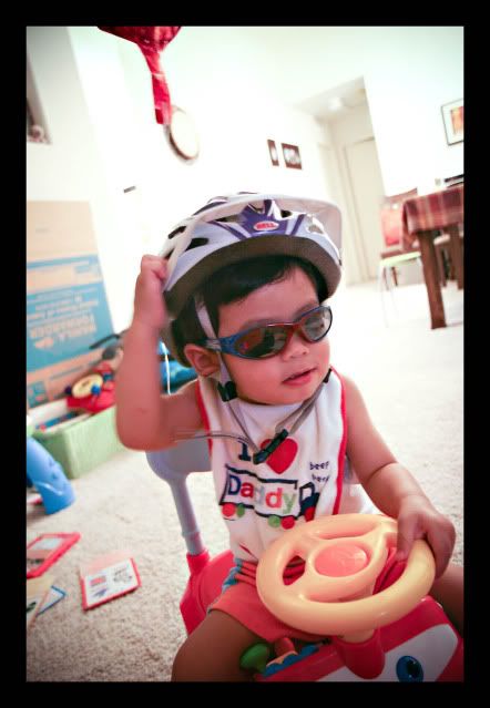 We don't really have any big plans for the coming long weekend. Angel and I figured to spend the free time to go biking and just be with Rafael. So tonight, I came home from Sports Chalet with a bicycle helmet for Angel. Rafael quickly took notice when Angel tried it on so she had him wear it. Once he had it on, we expected that he'd take it off as soon has he felt the weight. It's a little heavy for a toddler like him. Funny thing was he kept it on, sat on his mini Car and went on to watch his favorite show as if thinking that he needed to have the helmet like his bib or something.